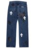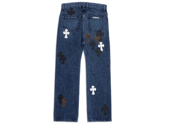 The Chrome Hearts Fleur Knee Cross Patch Jeans feature carefully placed cross patches with a signature fleur-de-lis pattern positioned directly at the knees. The denim has a slightly aged finish, adding natural depth and wear to the fabric while the leather patches bring a strong visual contrast. Each patch is stitched with clean edges, keeping the look refined but still bold. Built with a straight-leg cut and mid-rise fit, these jeans maintain a timeless structure that balances statement detailing with easy wearability.