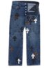 These jeans use standard unisex denim sizing. For the best fit, select your regular waist and inseam measurement. The straight-leg cut provides room through the leg without feeling baggy. For a relaxed look, size up by one. The patches are stitched flat to maintain comfort while moving or sitting.